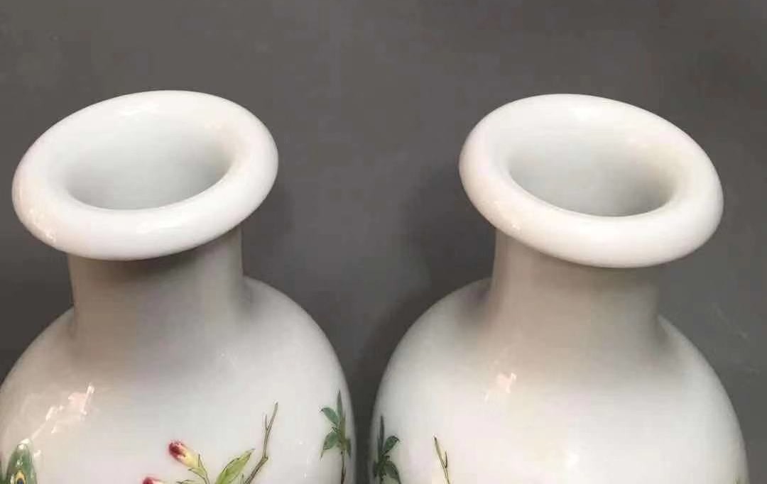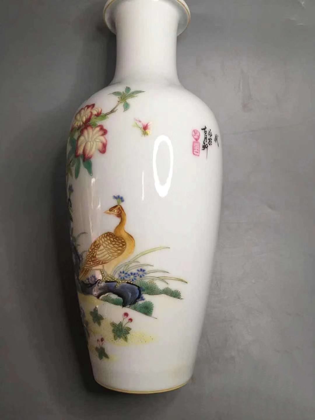 此对瓶的画工,到了令人惊叹的地步:孔雀开屏,层次分明,前后错落有致,花朵各异,瓣瓣有变化,其精美令人喜欢。