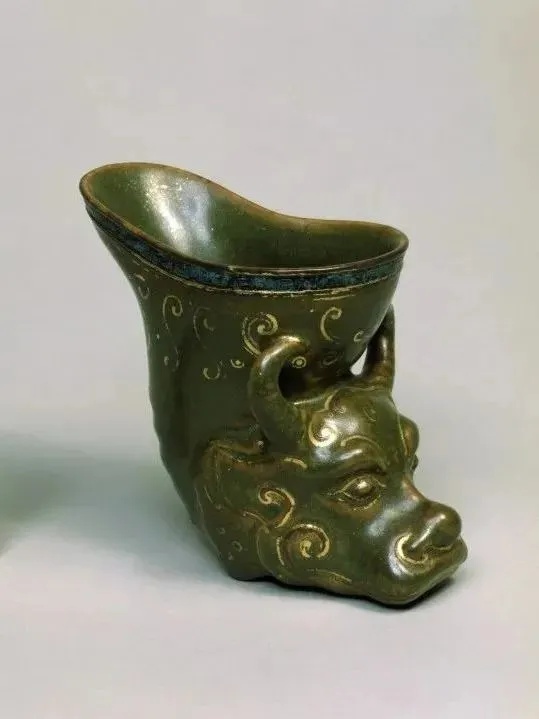 ▼清乾隆 青绿釉描金牛头杯