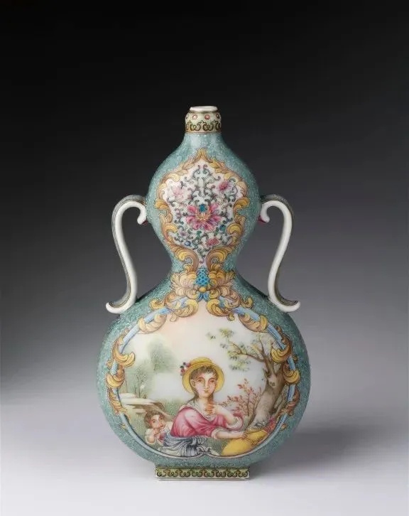▼清乾隆 珐琅彩开光人物双耳葫芦瓶