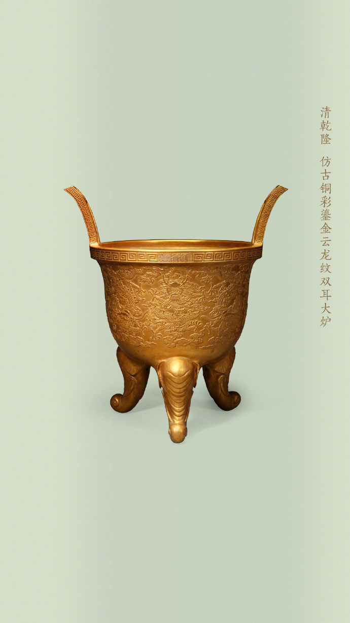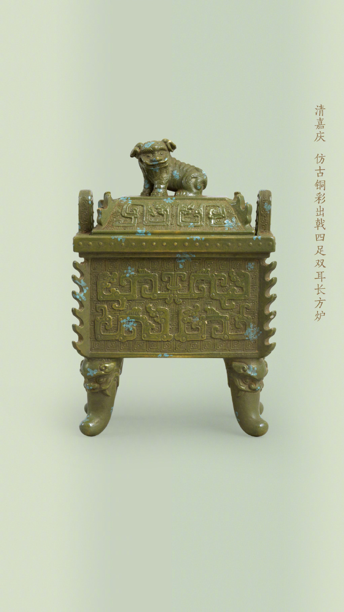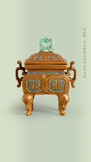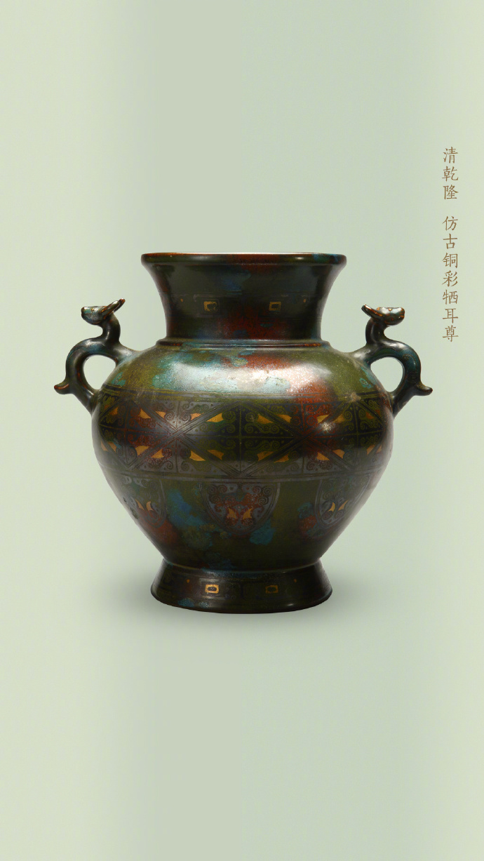 鼎、觚、炉、尊等本属于商周青铜礼器的造型,被清代工匠“复刻”到了瓷器上,温润柔和的陶瓷材质,也被赋予了青铜的威仪气质。这种以仿青铜器型为代表的“仿古瓷”,在造型设计上追摹上古礼器,常见于乾隆朝,器形规整对称、稳重大方,承载着礼制与正统的象征意义。