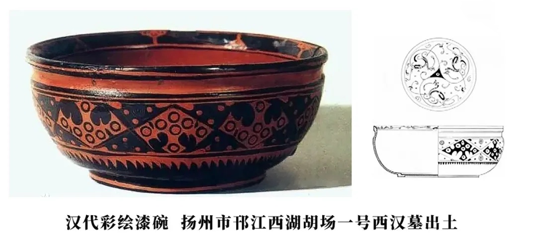如扬州市邗[hán]江西湖胡场一号西汉墓出土的一件汉代漆碗,碗高7厘米、口径15厘米,外腹黑地朱绘的几何纹样或是仿自当时流行的绮纹,碗内心在朱地上用黑漆细勾首尾相衔的三只朱雀。