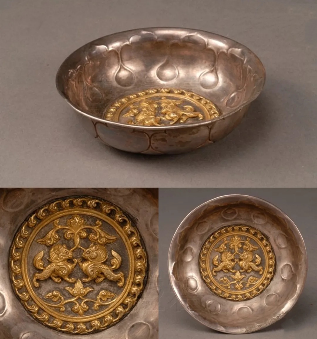 ▲唐 鎏金双狮纹银碗 西安何家村出土 现藏于陕西历史博物馆
