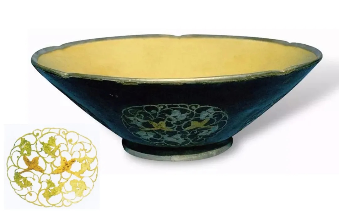 ▲唐 鎏金银棱平脱雀鸟团花纹碗 陕西扶风法门寺出土