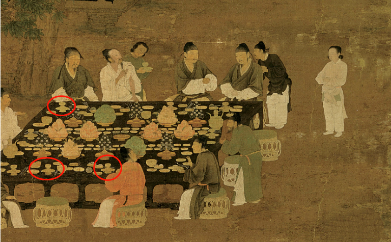 ▲北宋 传宋徽宗赵佶亲绘《文会图》, 台北故宫博物院藏。宴会桌面上每人必备一套饮茶用具茶盏、盏托。