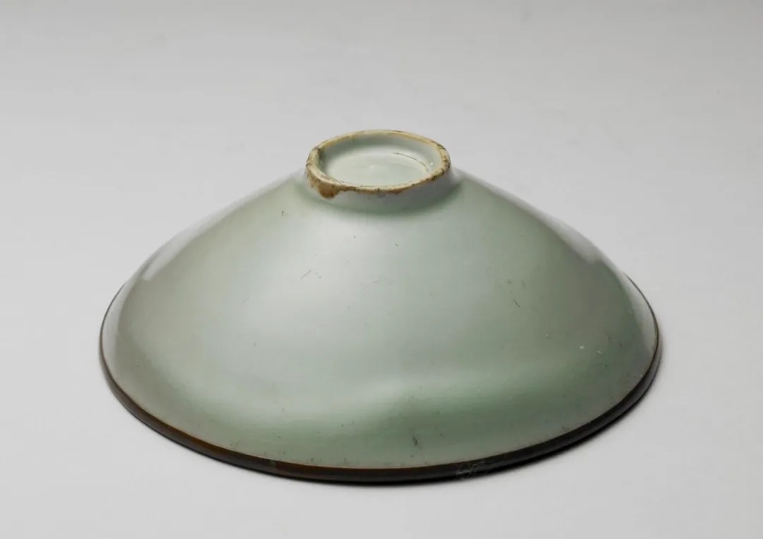 ▲本器为宽侈口的斗笠式茶盏,口沿嵌有金属釦;内外均施青釉,浓润明净。