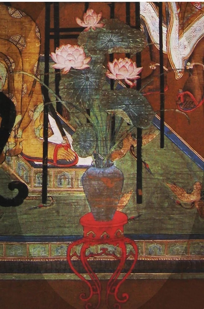 其造型与宋代陆忠信绘《十六罗汉图·第三尊者》中朱漆花几上的插花所用的瓶型相似(图5-2),只是画中所绘瓶口为广口,而汝窑窑址所出的为盘口。因此佐证出此器为厅堂插大折枝花用的花瓶。