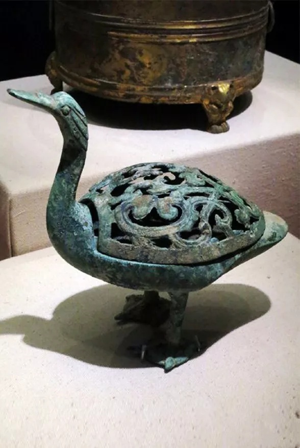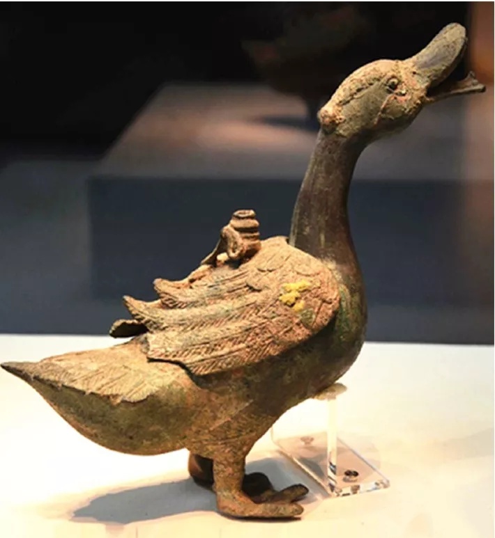 图6-2 汉代鸭形铜熏,河南省南阳市博物馆藏