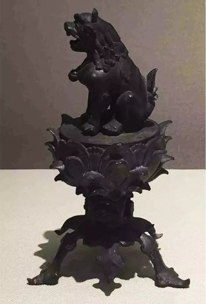 安徽宿松北宋元佑二年(1087)墓出土一件吉州窑绿釉狻猊香熏(图8-3),沈阳新民辽滨塔塔宫出土一件辽代狻猊莲花三足铜炉(图8-4)。