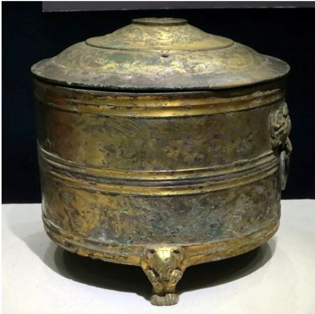 图11-3 汉代鎏金三熊足铜樽,南阳市博物馆藏