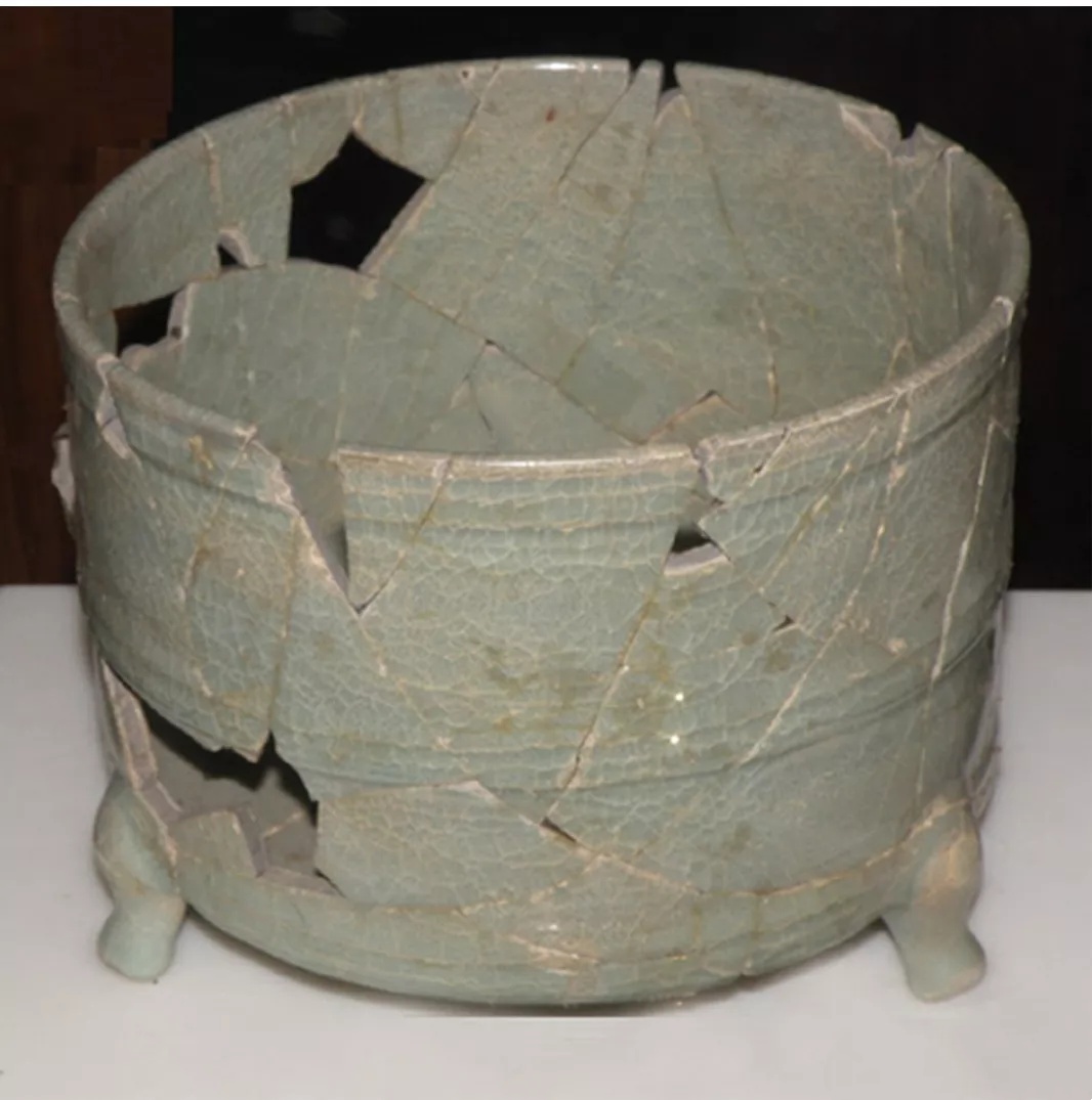 图12 南宋龙泉窑青釉贴塑缠枝菊纹奁式炉,绍兴市钱清镇环翠塔地宫出土