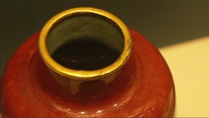 而器物下部至底边因釉厚而近于黑红