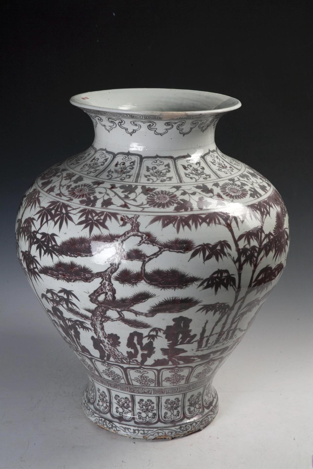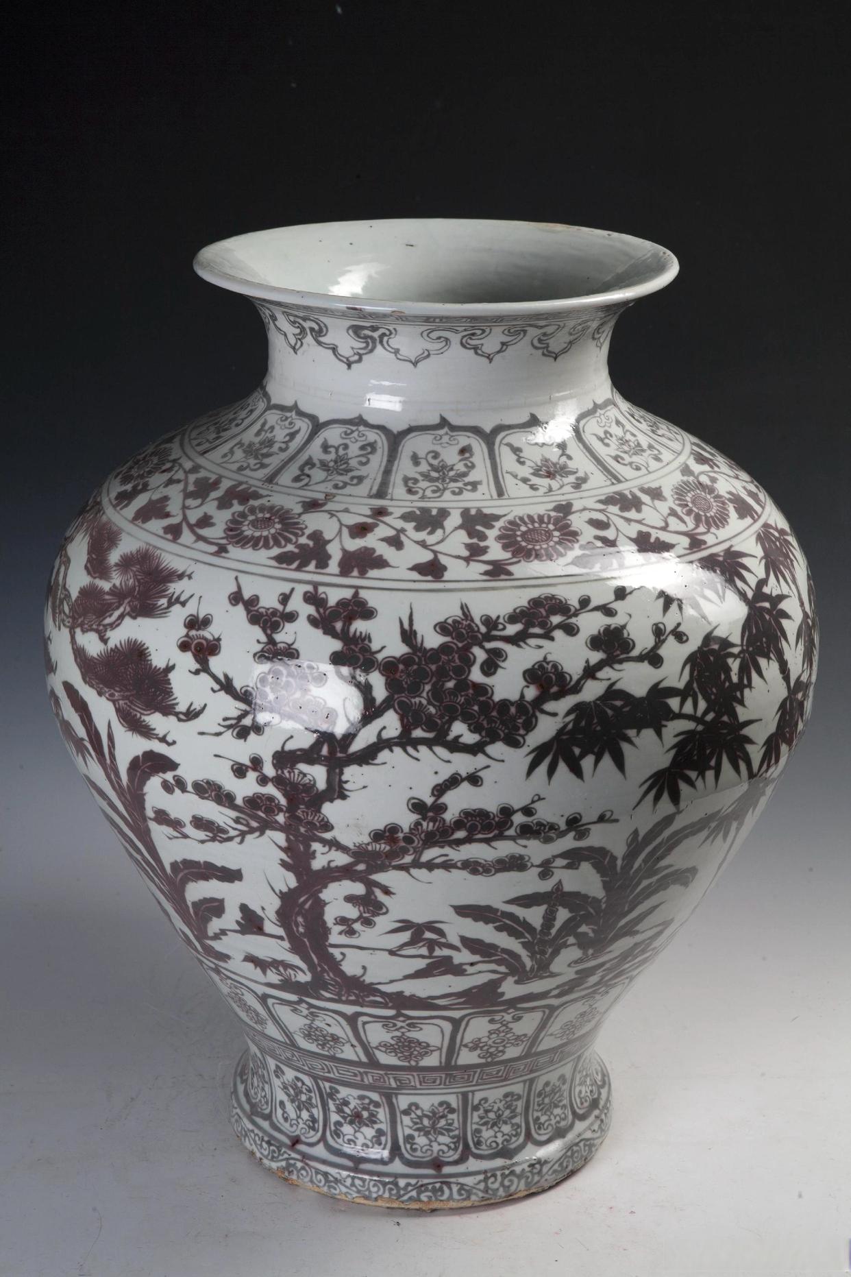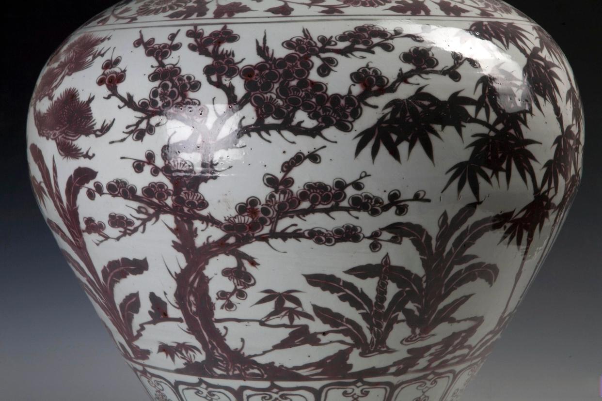 釉里红创烧于元代景德镇窑,成熟并盛行于明代洪武时期。这件釉里红松竹梅纹罐,器型硕大规整,胎体厚重,釉质肥厚,呈青白色。口沿处绘制如意云纹,颈部为变体莲辦纹,肩部装饰缠枝扁菊花纹,腹部主题纹饰为松竹、梅“岁寒三友图”,并配有蕉叶和坡石作为讨托。器物腹下部绘有两组莲花瓣纹,间隔处绘制回纹,圈足边沿装饰卷草纹,画面层次多达八层,但主题突出,主次纹饰鲜明,繁而不乱,承袭了元代的绘画风格,展现出多层次彩绘的独特风貌。