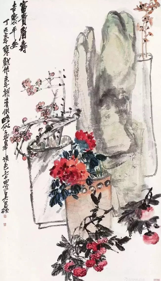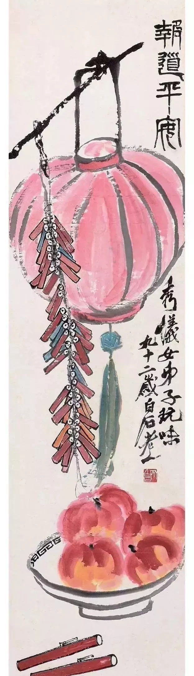 清中后期,“岁朝图”在书画领域很是盛行,画家们以清供之品入画,兼工带写,敷衍成诗,使之成为图文并茂的文人画。这一风气在扬州画派和海上画派中尤为兴 盛,许多画家都创作过“岁朝图”,有代表性的就有李鳝、赵之谦、任伯年、吴昌硕等。其中,任伯年的天竹、齐白石的万年青都堪称佳作。