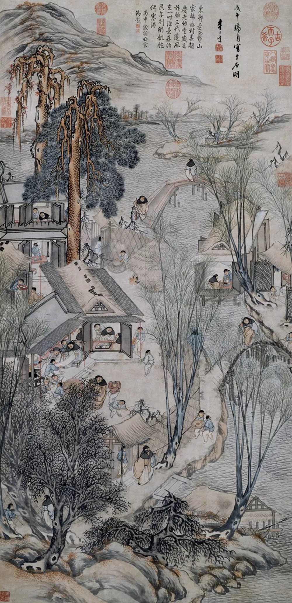 ▲[明代]李士達《歲朝村慶圖》,紙本設色,132.9×64cm。私人藏品。
