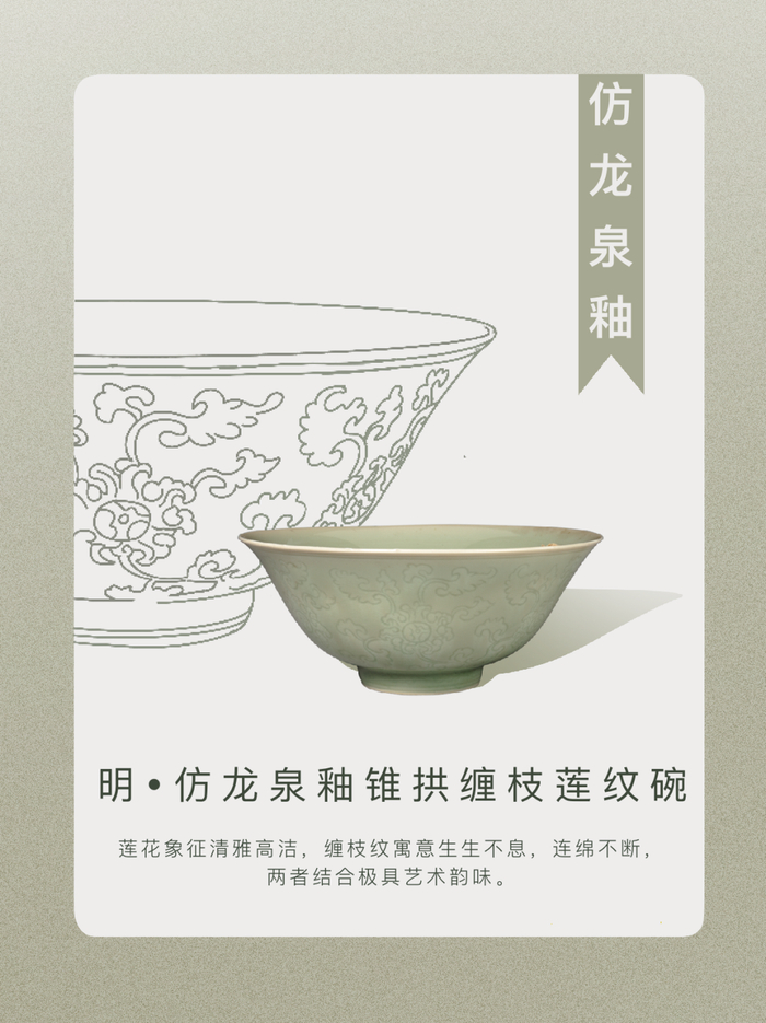 龙泉瓷胜似美玉,以梅子青和粉青最负盛名。明初龙泉曾和景德镇共同承烧御瓷。景德镇自御窑建立之初,学其精髓,仿烧出高质量的龙泉釉色。缠枝莲纹以锥拱技法刻画,线条流畅,层次分明,使得碗的整体效果生动立体。