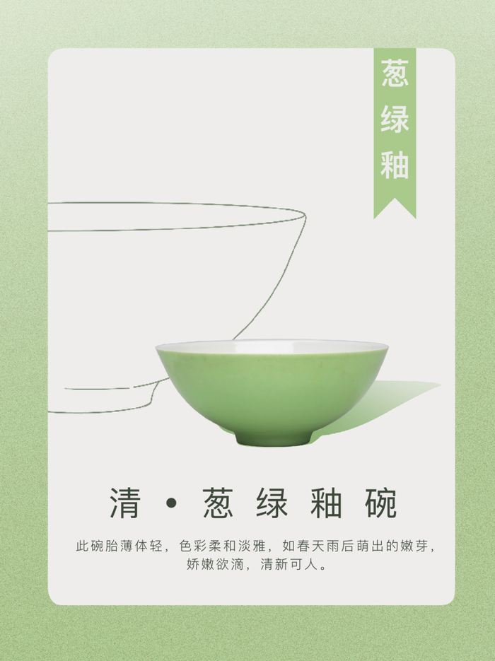 雍正时期的葱绿釉,娇嫩欲滴,如春天雨后青空下的嫩芽。此碗造型可爱小巧,生机勃勃的葱绿釉,俏皮活泼,清新可人。