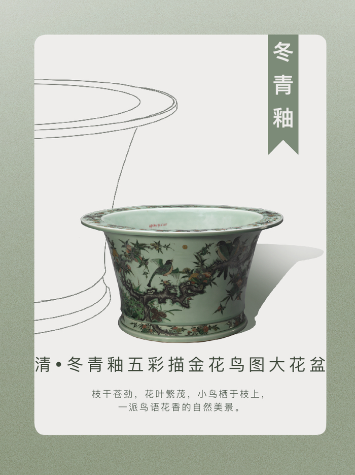 康熙五彩古拙浑厚,硬朗恢奇。此盆以冬青为地,外壁通体描绘五彩加金花鸟图景,构图舒展,清新宜人。苍翠的冬青与艳丽的五彩相遇,美不胜收。