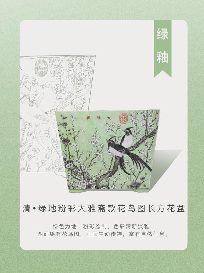 慈禧太后大雅斋瓷器清和精雅,充满女性的娇柔之美,是清代御窑的最后一个高峰。此花盆通体以绿色为地,绘绶带鸟立于遒劲的梅枝上,线条流畅、笔法圆润,画面柔和自然,呈现清丽高雅的意蕴。