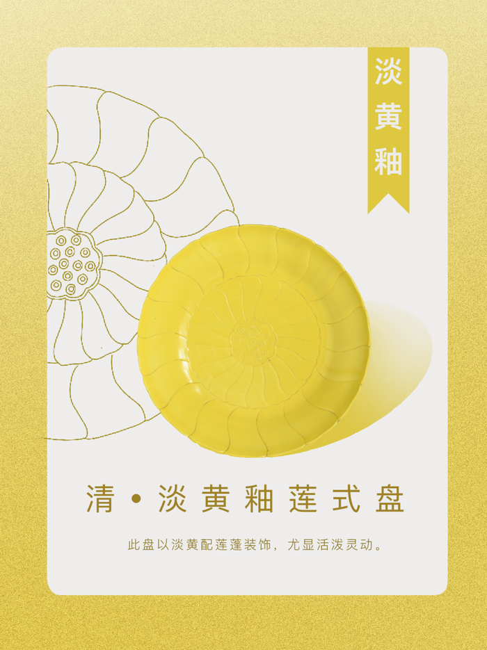 淡黄釉又称“西洋黄”,为宫廷端庄大气的正黄之外,带来一缕清爽明快的新风。此盘以淡黄配莲蓬装饰,尤显活泼灵动。