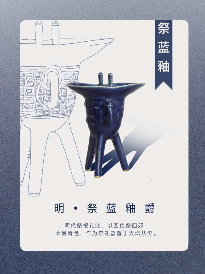明代祭祀礼制,以四色祭四郊,此爵青色,作为祭礼器置于天坛从位。爵是祭祀活动中必不可少的用具,明代祭祀用器改用瓷。