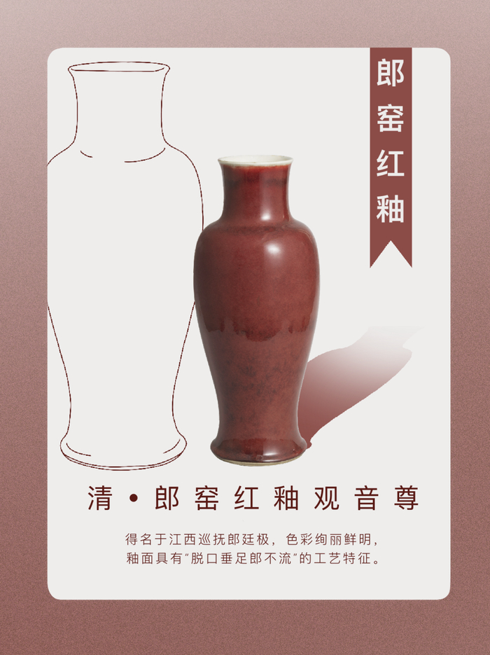 康熙晚期,江西巡抚郎廷极督烧御窑,以仿古瓷成就最高,与真无二。尤以仿明宣德鲜红釉瓷最具代表,称“郎窑红”,釉面具有“脱口垂足郎不流”的工艺特征。