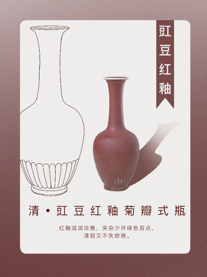 “绿如青水初生日,红似朝霞欲上时”。豇豆红釉创烧于康熙时期。造型秀雅,色彩淡雅宜人,有“美人醉”“娃娃脸”“桃花片”之称。几无大器,多为宫廷文房用具。