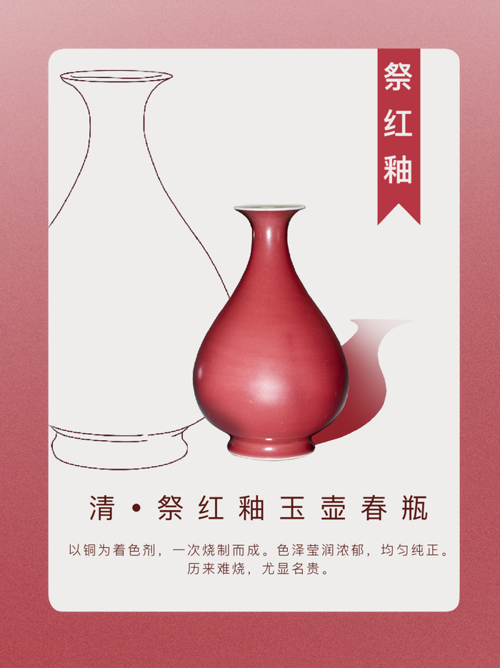 霁红釉又称积红釉、醉红釉、宝石红釉,因作祭祀郊坛之用,故又名祭红。祭红釉玉壶春瓶以北宋时期创烧的酒器玉壶春瓶为样式,是清代宫廷经典陈设器型,明清时也常作国礼赠送给外国使节或贵族。