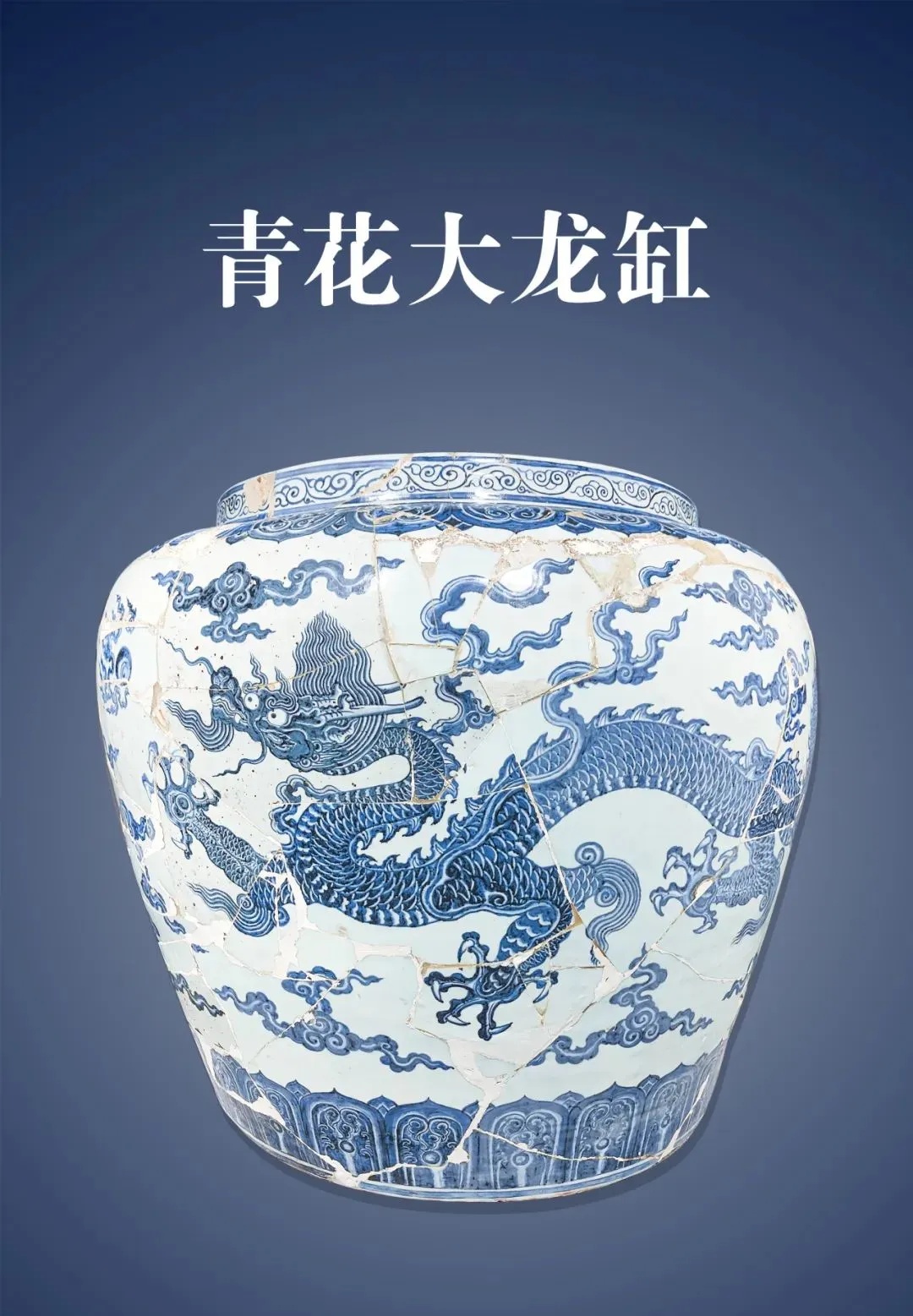 瓷制龙缸累烧不成,导致残次品、落选品极多。明代时期,对于落选的瓷器,大多是将其打碎,集中掩埋。我们看到的这件“明正统青花云龙纹大缸修复件”便是由若干个不同时期的龙缸瓷片拼接而成的。2018年由景德镇民间收藏家捐赠入藏。