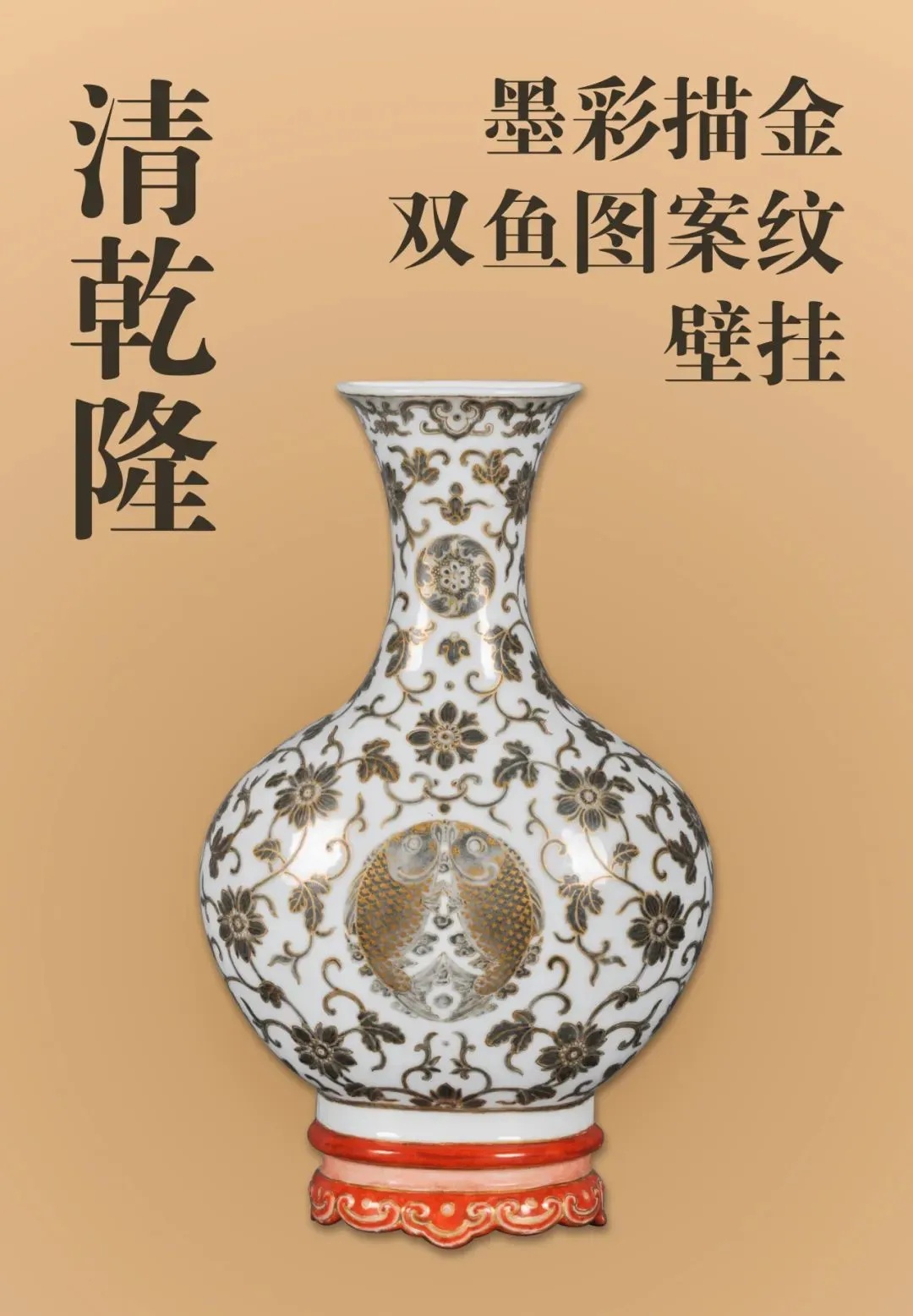 壁瓶,又叫“挂瓶”或者“轿瓶”,是挂在墙上或者轿中的一种装饰品。它既可以插入各种时令的鲜花,也可插干花、绢花等。您现在看到的这件壁瓶,形状宛如剖开的半个花瓶,靠墙的一面平坦而有孔,可以系绳悬挂。它采用墨彩描金的装饰工艺绘画出缠枝花卉纹、双鱼纹,设计巧妙,极富观赏价值。