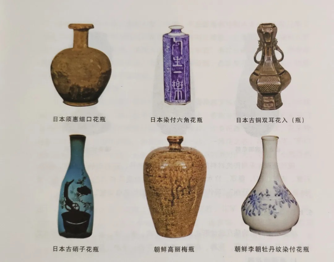 外国花瓶的形式与工艺,体现出地域的社会文化特征和经济发展水平,典型的有日本须惠④细口花瓶、日本染付⑤ 六角花瓶、日本古铜双耳花入(瓶)、日本古硝子⑥花瓶;朝鲜高丽梅瓶,朝鲜李朝牡丹纹染付花瓶等。
