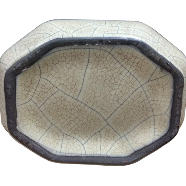 《哥窑八方贯耳穿带扁瓶》哥窑八方贯耳穿带扁瓶,器形高贵古朴,为历代宫廷珍藏。通体施米黄釉,釉质温闰如玉,质感如肤之微汗。“金丝铁线’呈曲线网状布满器物全身,片绞灵动。八方口满釉如堆脂。