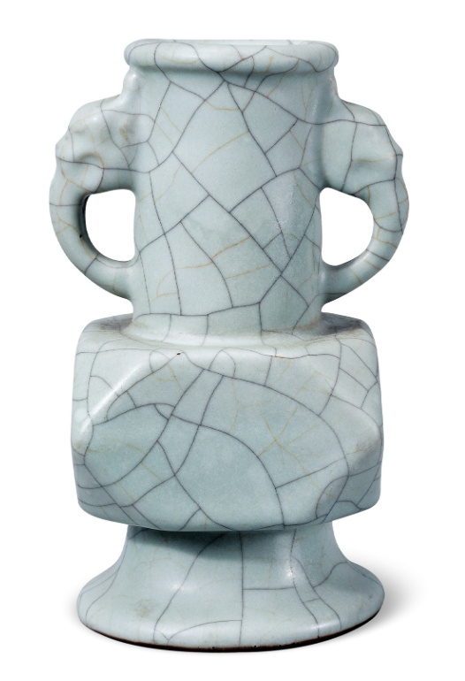 瓶唇口,直颈,颈两侧饰对称象耳,方腹委角,高圈足外撇,圈足呈铁黑色。通体施仿宋官窑天青色釉,釉质肥厚,开有大纹片。外底青花书“大清雍正年制”六字三行篆书款。清代雍正的仿官器,一改古朴浑厚的形象,代之以典雅秀丽的艺术风