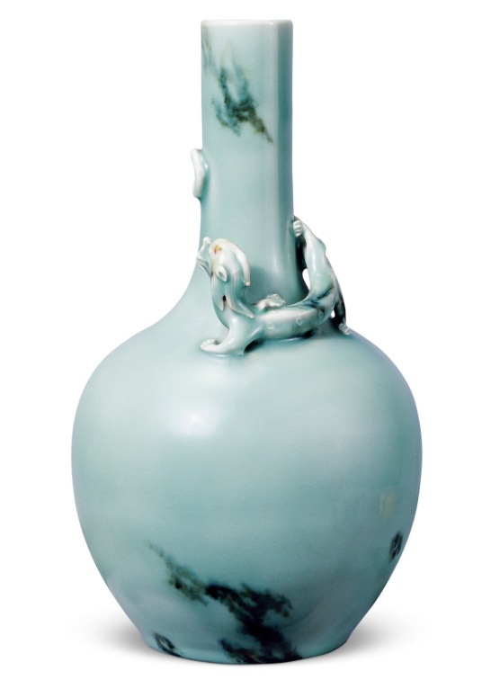 直口,长颈,圆鼓腹,圈足。颈肩部堆贴一螭龙,器通体施仿石 釉,底足施酱釉。外底青花书“大清乾隆年制”六字三行篆书款。清代乾隆时期盛行以瓷釉仿各种手工艺品,仿石釉用色泽相似于各色石质的彩釉,勾画出石头的纹理,色泽模仿逼真。