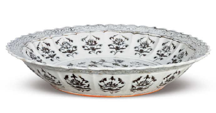 洪武官窑青花瓷器传世品较少,此盘为洪武时期的典型器物,承袭元代青花大盘形制,制作规整,纹饰细致,布局严谨,笔法描绘简练娴熟,豪放生动,风格朴实,底足沙底呈火石红色,火石红色为工匠有意涂刷而成,洪武时期瓷器底部也有自然呈火石红色的,是由于胎土本身含有铁质,经窑火烧结而呈现红色。这两种红色,元代多见,经明代延续到清代中叶,到清乾隆以后才完全消失。洪武官窑青花钴料与元青花的钴料成分-致,均系进口钴料,但洪武青花呈色多数呈灰蓝色,不如元青花呈色鲜艳透亮。清人蓝浦《景德镇陶录》载:“洪武二年(1369),设厂于镇之珠山麓,制陶供上方,称官窑,以别民窑。”御密厂对瓷器的挑选极为严格,烧坏的瓷器打碎深埋,不许流入民间。这反映出御窑厂对御用瓷器要求之严格,御窑厂不计成本,追求精美,烧造的品种有青花、釉里红、红釉、白釉、蓝釉和酱釉等。洪武时期青花瓷器造型主要有炉、瓶、壶、罐、盘和碗等。