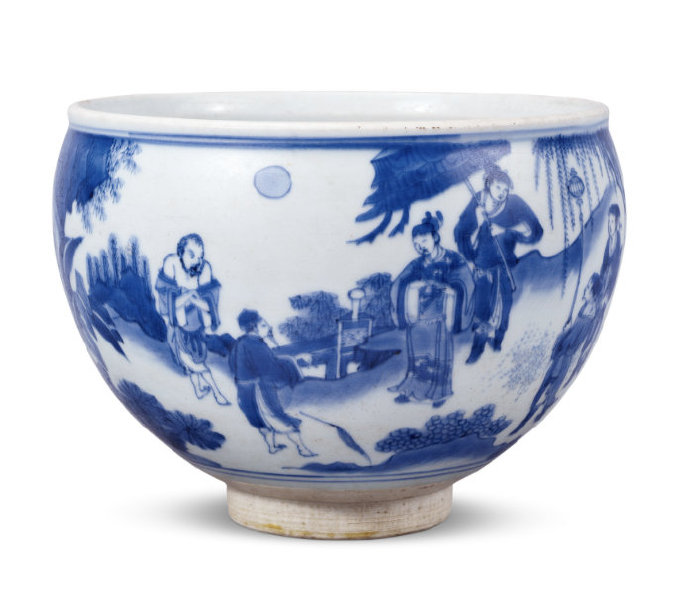 唇口,圆腹下敛,高圈足。通体绘山水人物故事图。长方形开 光内青花隶书“大明国江西道南昌府南昌县,信士商人萧炳喜助净水 碗壹付,供奉萧公顺天王御前。崇祯拾贰年仲秋月吉立”五行四十四字。崇祯十二年即公元1639元,是明崇祯青花瓷断代的重要标准器。净水碗为佛前供器