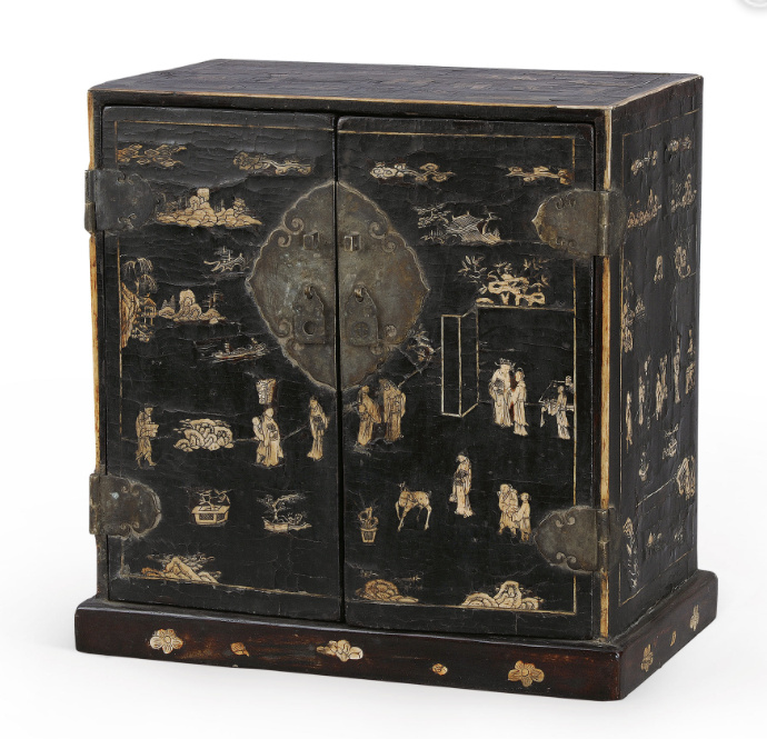 黑漆嵌骨山水人物纹五屉官皮箱