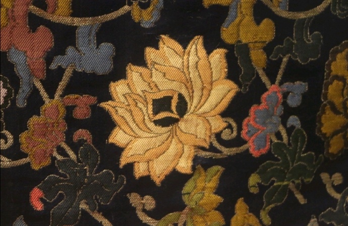 牡丹花硕大而娇艳,瓣肥圆曲,层层围拢,呈现出一种豪门富贵的气派,位居群芳之首,素有“花王”之称,被誉为“国色天香”。唐代之前,并无牡丹之名,它是由芍药培育出来的一种名花,主要供观赏之用。自此以后,成为诗人画家乐于书写、描绘的题材。在云锦的图案中,表现牡丹的纹样也特别多,各种形式都有。这样的选择并不是偶然的,而是华贵富丽的一种合韵。