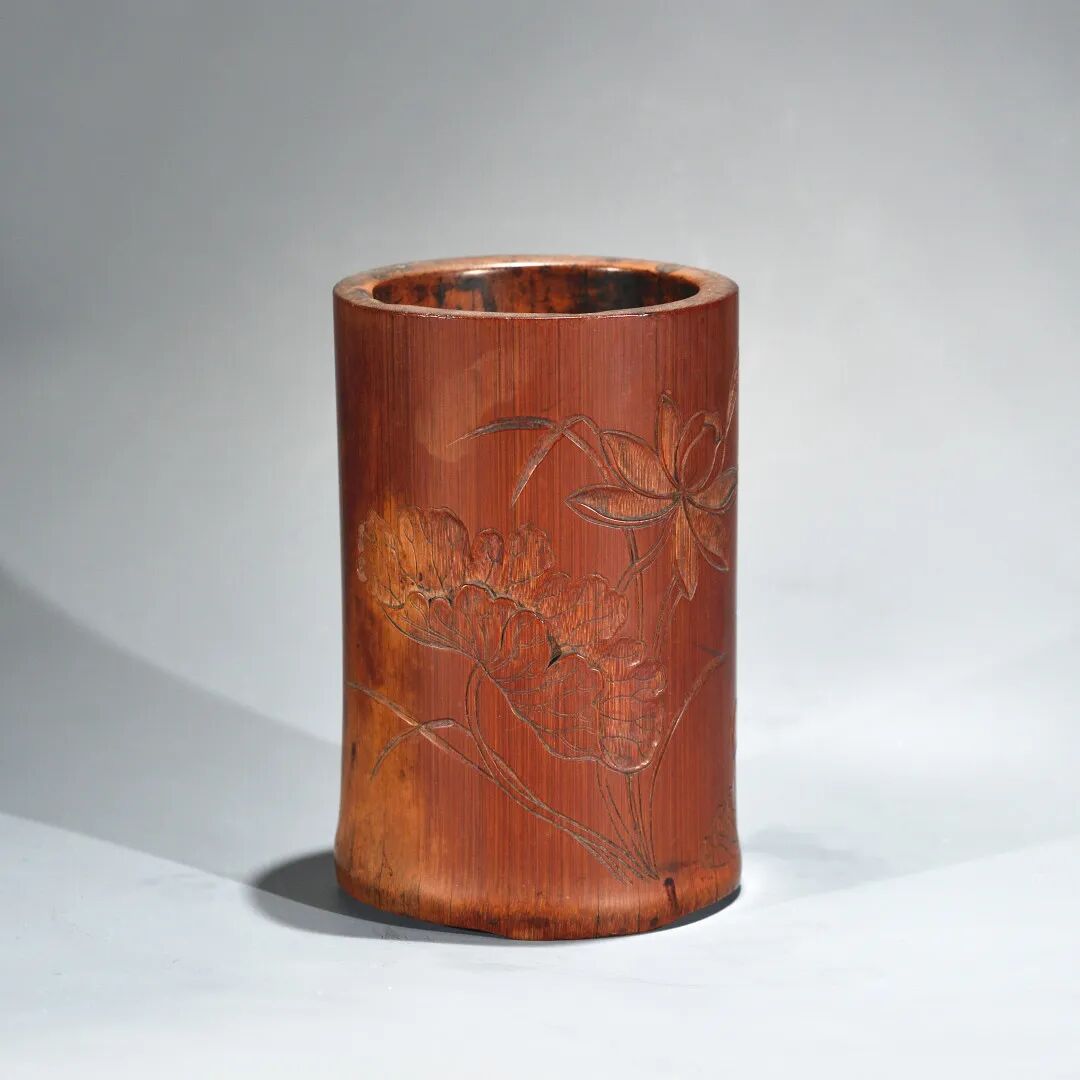 清 翁伴石刻荷花图竹笔筒