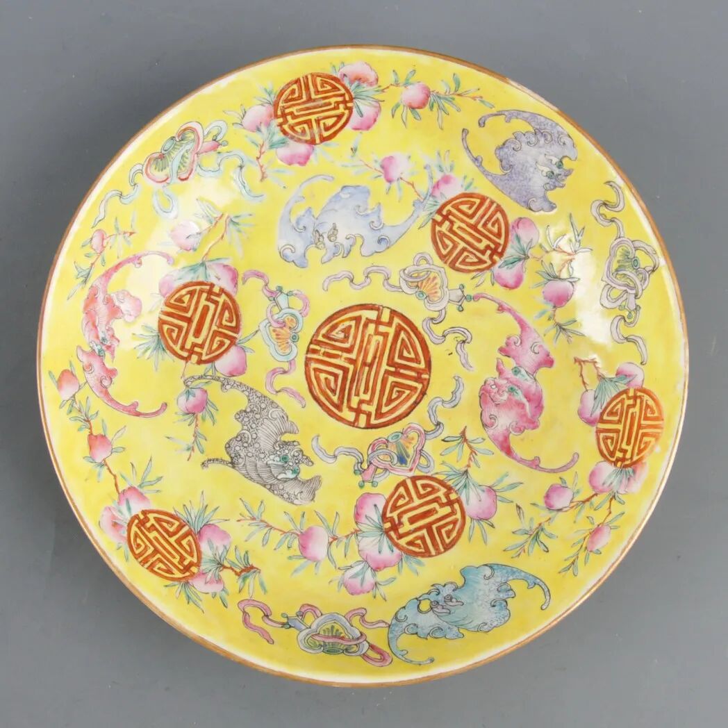清“大清同治年制”款黄地蝠寿纹盘