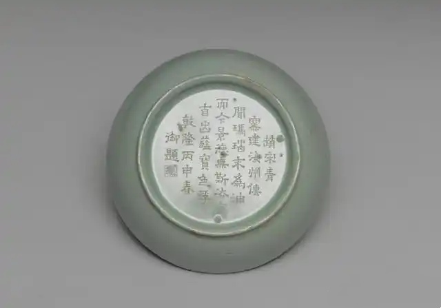 底刻乾隆皇帝〈咏汝窑盘子〉:「赵宋青窑建汝州,传闻玛瑙末为油。而今景德无斯法,亦自出蓝宝色浮」御制诗。