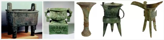 左至右依次为鼎、簋、觚、斝、爵