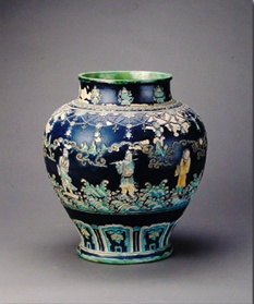 璎珞纹是陶瓷器装饰纹样之一。璎珞原是用丝线将珠石编串成多层次的装饰物品,《晋书·林邑国传》载:“其王服天冠,被璎珞。”将璎珞形象用于塑像或其他器物为装饰纹样,称璎珞纹,始见于元代瓷塑宗教人物像上,多为景德镇窑与龙泉窑的瓷塑观音、菩萨。表现方法为模印或贴塑,以首都博物馆藏元代青白釉观音坐像最为精绝。坐姿观音微闭双目,端庄慈祥,自发髻而下全身纷披璎珞,神采奕奕。入明以后,樱落脱离人物独立使用,往往成为佛教或道教的象征,明代中期风行,多见于珐华器、青花器和五彩器。珐华器采用立粉画法,青花器与五彩器则采用笔绘手法。首都博物馆藏明成化珐华八仙纹罐,在罐的肩部饰一周璎珞纹,与腹部八仙过海纹相呼应,宗教意味浓厚。也有作为一般流行纹样应用的,如明中期珐华花鸟璎珞纹罐。璎珞纹的出现仅是一种装饰,并无宗教含义。