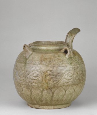 (故宫博物院藏青釉刻花忍冬纹单柄壶)