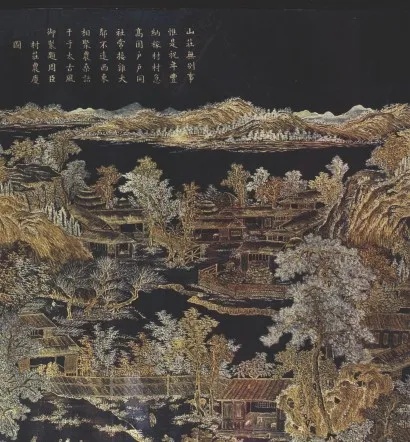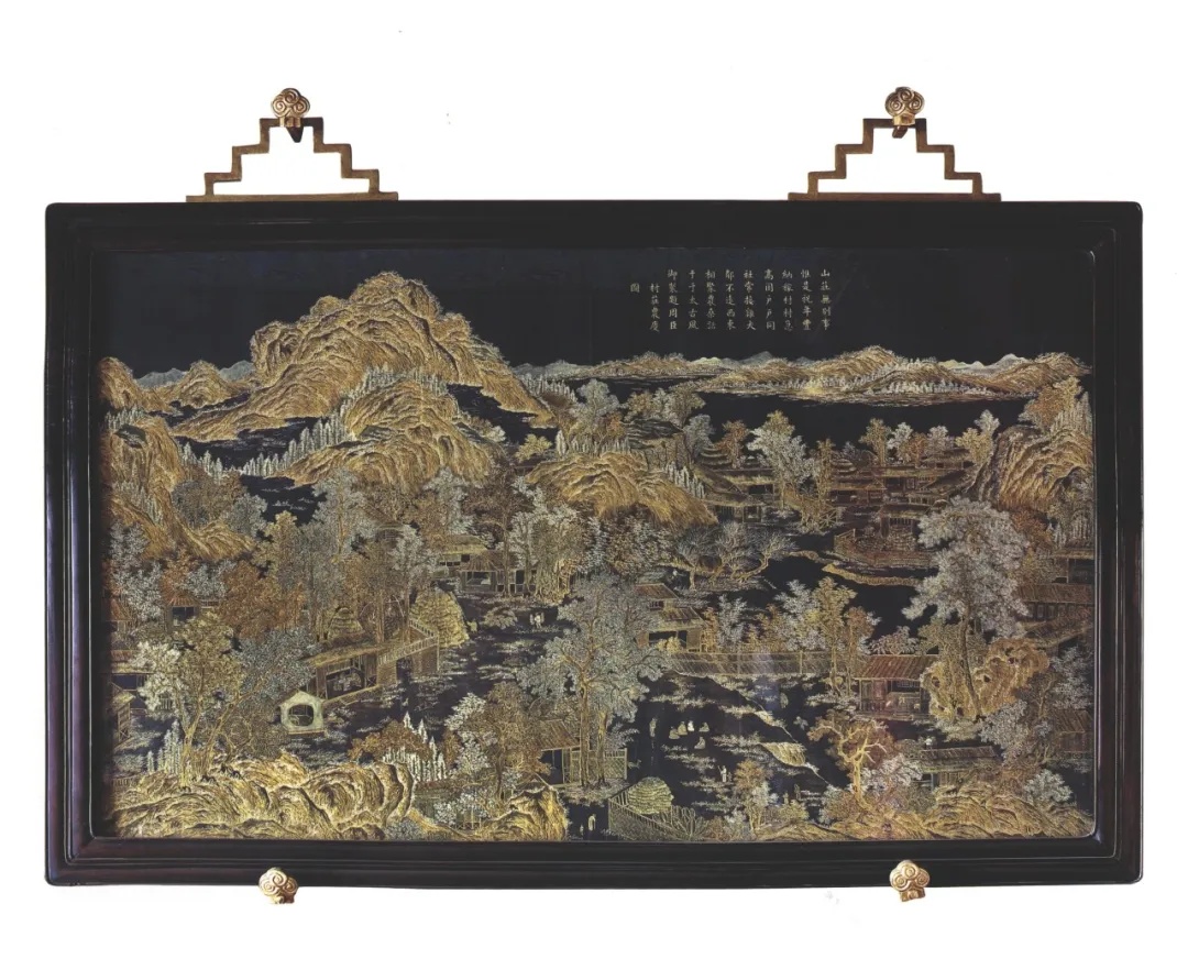 以清代紫檀木边框描金农庆图挂屏为例,其屏心在黑漆地上用描金手法绘出“农庆图”,山峰质感表现得淋漓尽致,树木、建筑细节丰富,画面上的金漆深浅不一,呼应了金秋的感觉,也为画面拉开了层次。