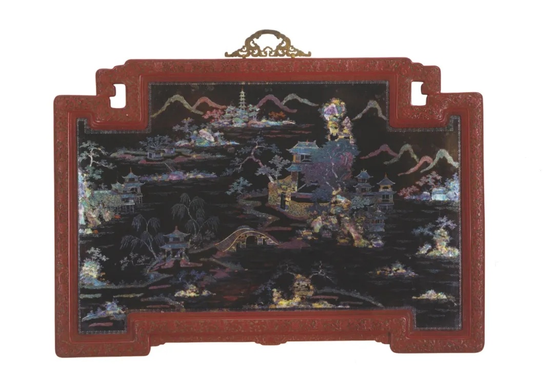 清代剔红边框嵌螺钿山水挂屏,其两件成对,正面屏心皆用五色薄螺钿嵌成山水图,亭台楼阁坐落于湖面,细致入微,螺片颜色不同,根据画面需求,点缀于不同地方,山光水色借螺钿之缤纷,展现得淋漓尽致。