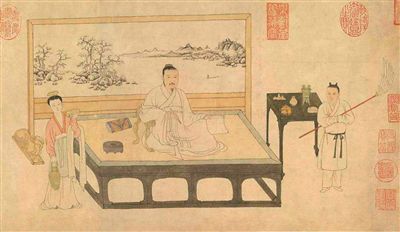 画面中的那些器物和陈设,表现出了倪瓒的高雅风格。案头的笔山、青铜和熏香都是文人家里常见的典雅陈设。倪瓒手中的书卷和毛笔也正好反映了倪瓒的书画人生。