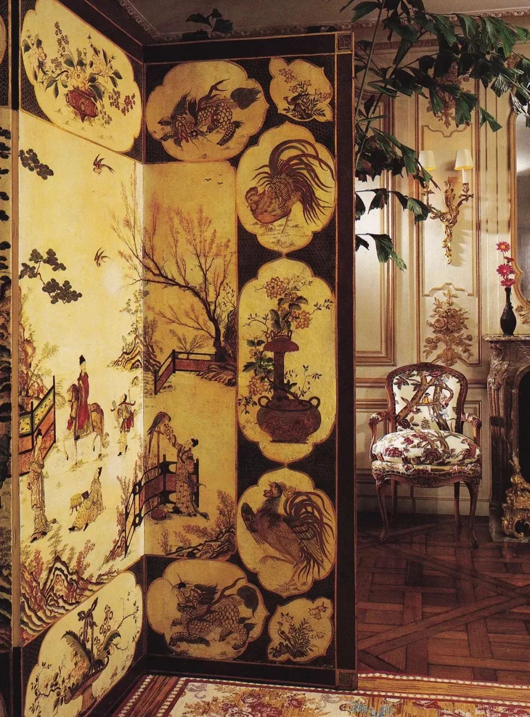 其中,西方人对屏风尤其热衷。屏风的材质格式各样,有的为漆木镶嵌,有的则是纸面,更有奢华者使用真丝制作。薄薄几扇屏风,却在室内辟出一方东方秘境。