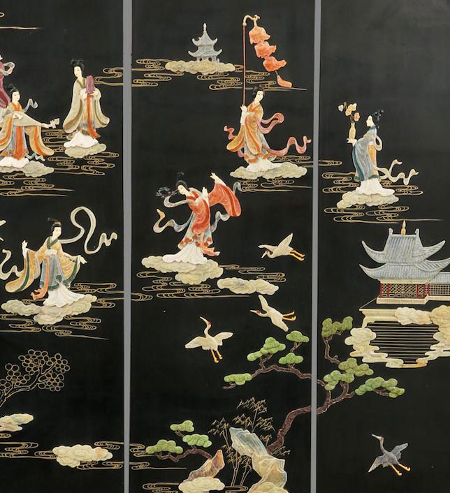 这幅双面四扇屏风诞生于20世纪的中国,是当时远销至欧陆的东方佳作。以黑漆为地,古雅大气,镶嵌皂石、母贝等华丽硬石,整体构图饱满,可见仙女腾云驾雾,翩跹奏乐,亭台楼榭间,仙鹤飞舞,青松迎客,饱含吉祥寓意。