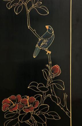 屏风背面亦大有乾坤,同样以黑漆为地,鸣鸟或栖于花枝之上,一派悠然情调。处处细节,皆彰显东方匠人的巧思精心,令人称奇。