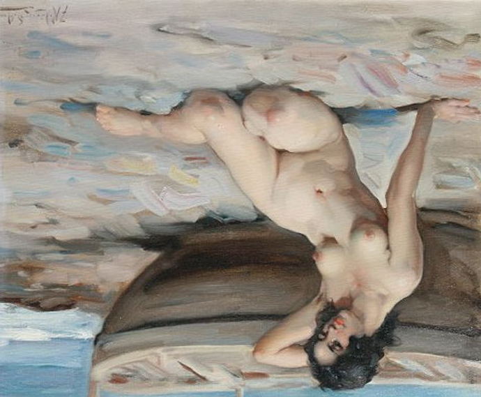 弗朗西斯科·罗德里格斯·桑切斯·克莱门特(Francisco Rodríguez Sánchez Clement 1893-1968)的《在海滩上赤裸着身体》是一幅印象派风格的油画佳作。画中一位曲线丰盈的裸女慵懒倚靠在沙滩上,臂枕脑后,背景停泊着古老渔船与湛蓝海天。艺术家运用松散笔触与温暖明亮色彩,捕捉阳光下肌肤的柔嫩光泽与海滨的宁静诗意,展现出女性躯体与自然环境的和谐之美。
